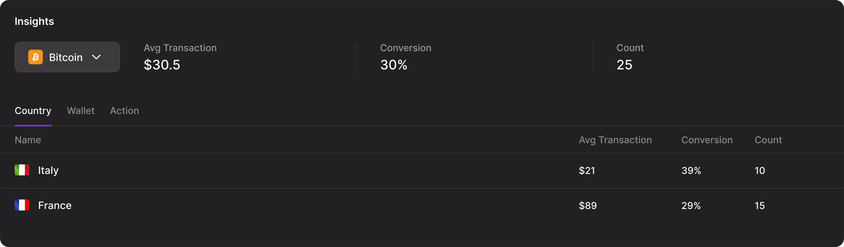 Each gateway used by your customers will have its own insights on conversions, opening rates, country, and more.